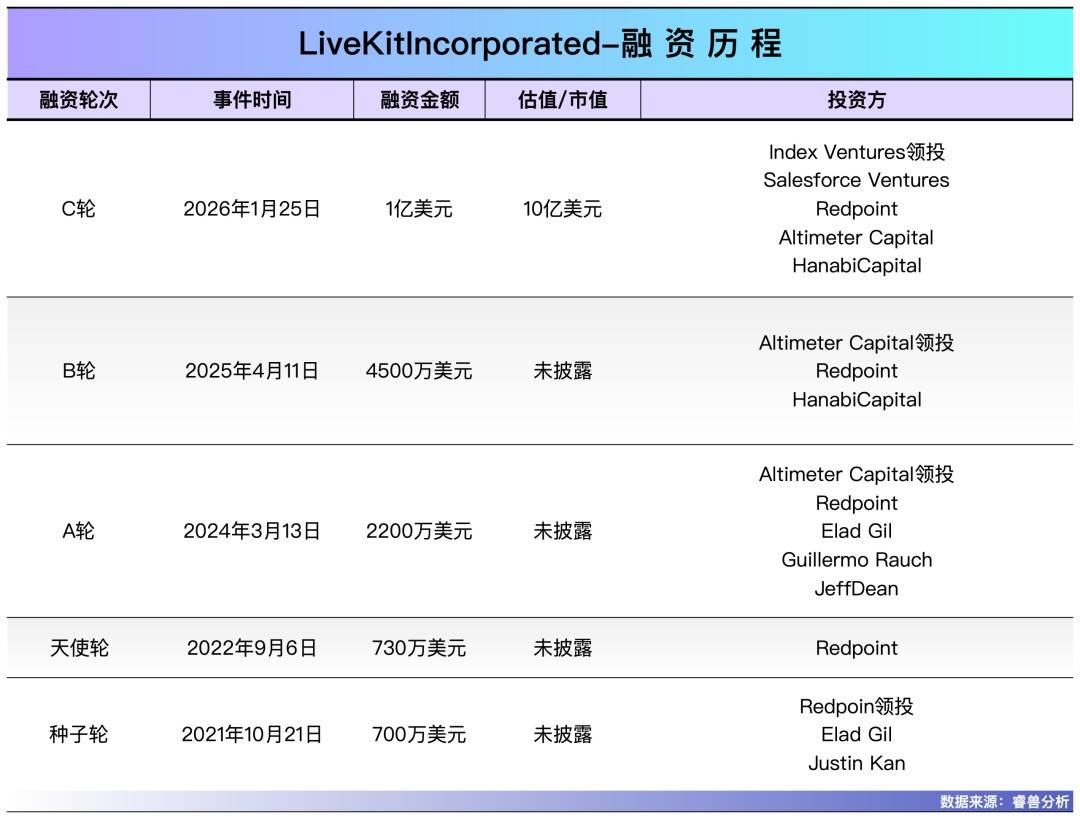 随着AI语音交互需求增长,LiveKit业务迅速扩展。2026年1月,公司完成由Index Ventures领投的1亿美元融资,估值达10亿美元,成为独角兽。此次融资距离其上轮融资仅10个月。