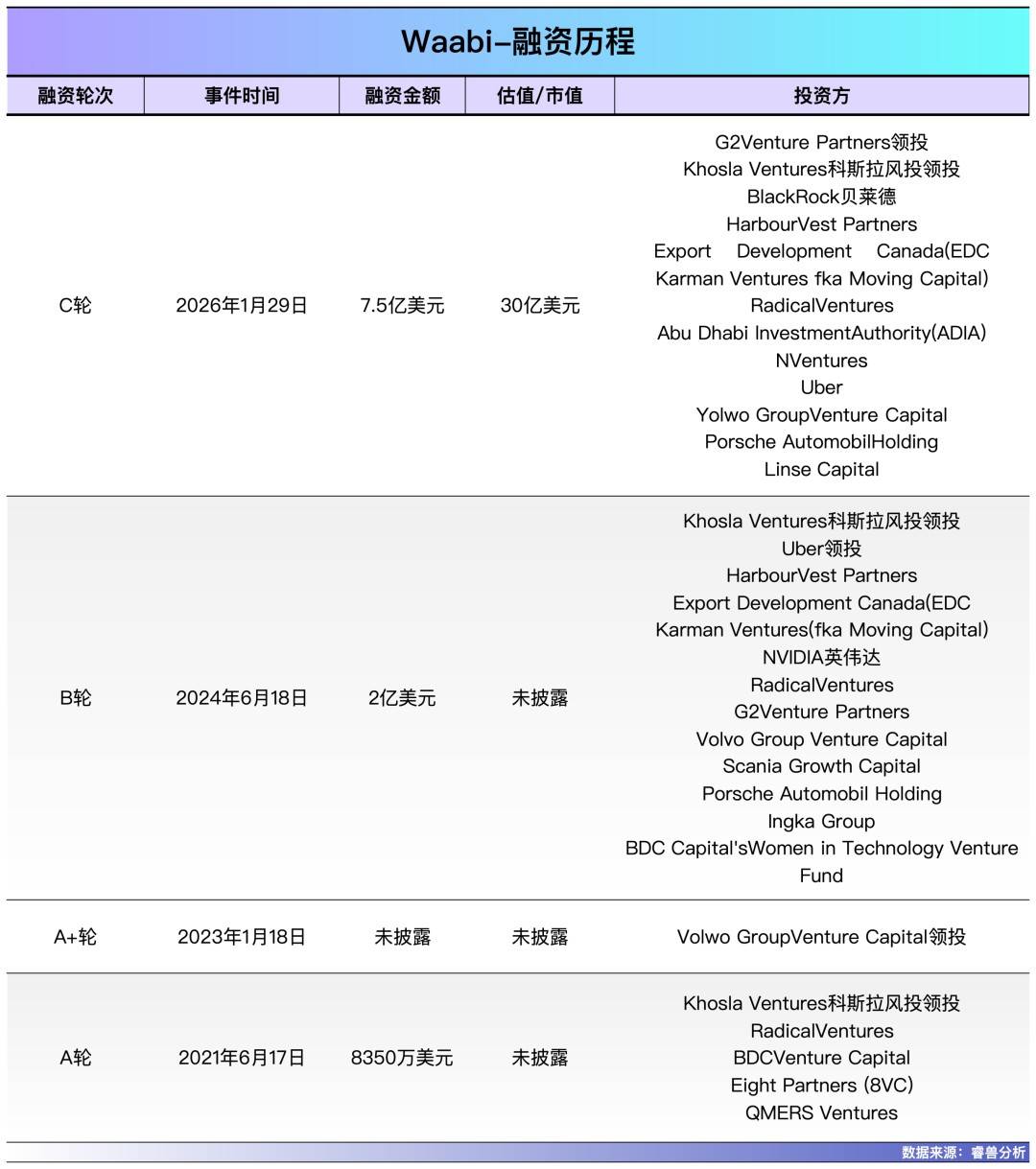 融资层面,Waabi于2026年1月完成总额10亿美元的新融资,包括由Khosla Ventures与G2 Venture Partners联合领投的7.5亿美元C轮融资,以及Uber的2.5亿美元战略投资。本轮融资后,公司估值升至30亿美元,成为全球自动驾驶领域估值最高的初创公司之一。