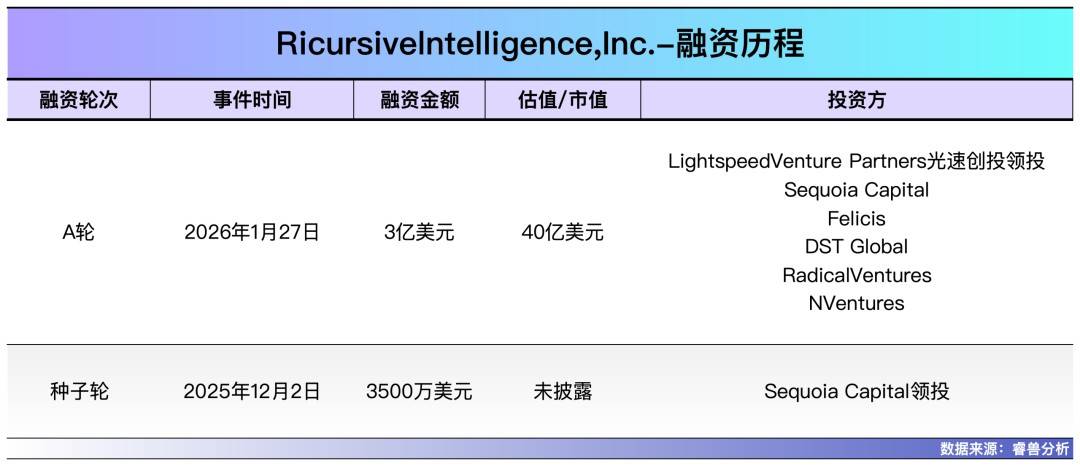 融资方面,Ricursive Intelligence成长速度惊人。公司刚成立时,就获得由红杉资本领投的3500万美元种子轮融资,彼时估值约7.5亿美元。仅一个月后,公司便完成3亿美元的A轮融资,估值飙升至40亿美元。