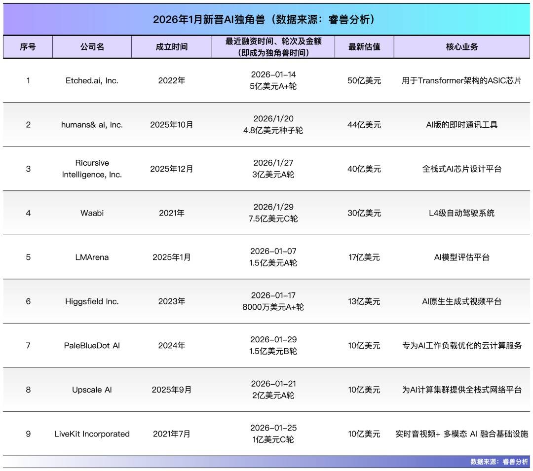 根据睿兽分析的统计数据,截至2026年1月31日,全球新增了24家独角兽公司,这些公司在本月完成了新一轮融资,估值首次突破10亿美元。