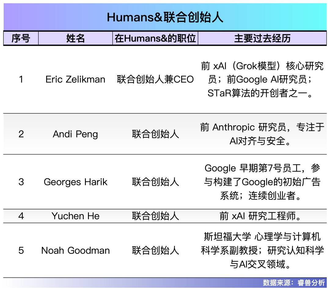 Humans&成立于2025年10月,其最突出的是豪华创始团队,5位联合创始人均来自OpenAI、xAI、Anthropic、谷歌、Meta等顶尖AI机构。