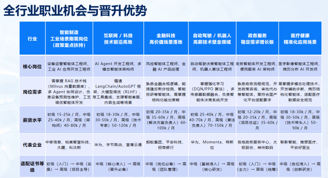 趋势红利:2027年智能体应用普及率将超70%,金融、制造、政务等多行业全面落地,岗位需求持续增长。
